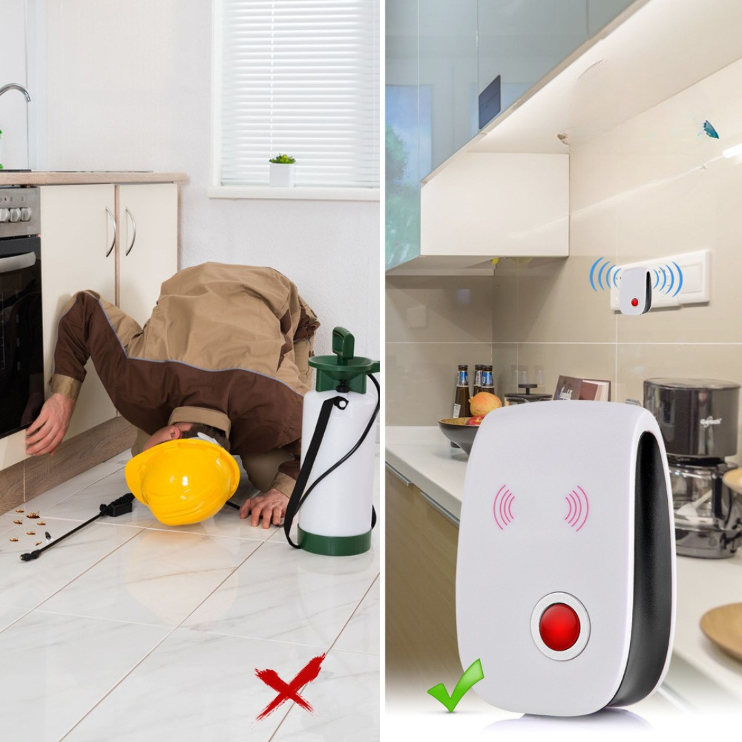 Denna avancerade skadedjursavskräckare använder ultraljudsteknologi som stör nervsystemet hos myggor, kackerlackor, spindlar, möss och andra ovälkomna gäster, utan att påverka människor eller husdjur.